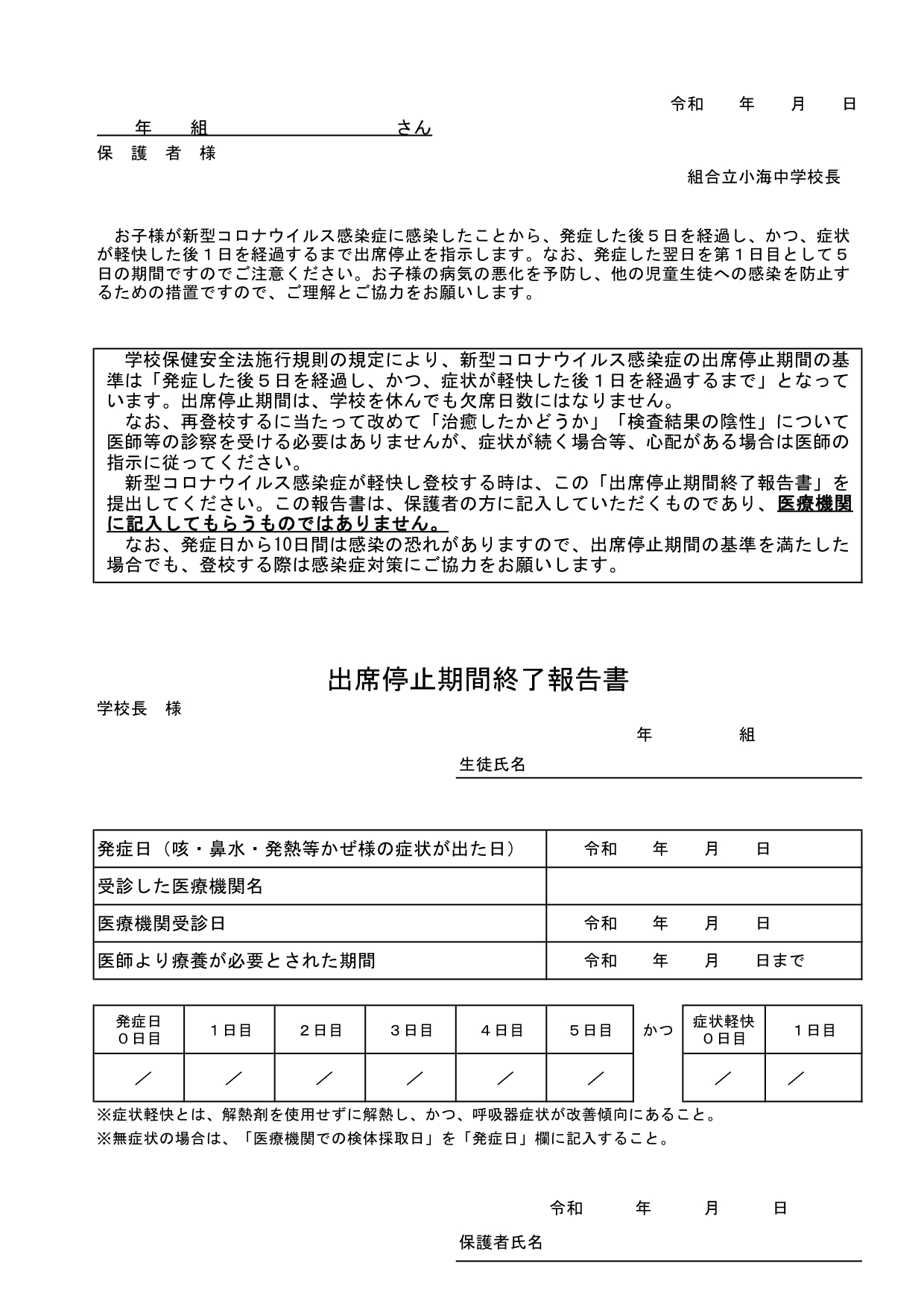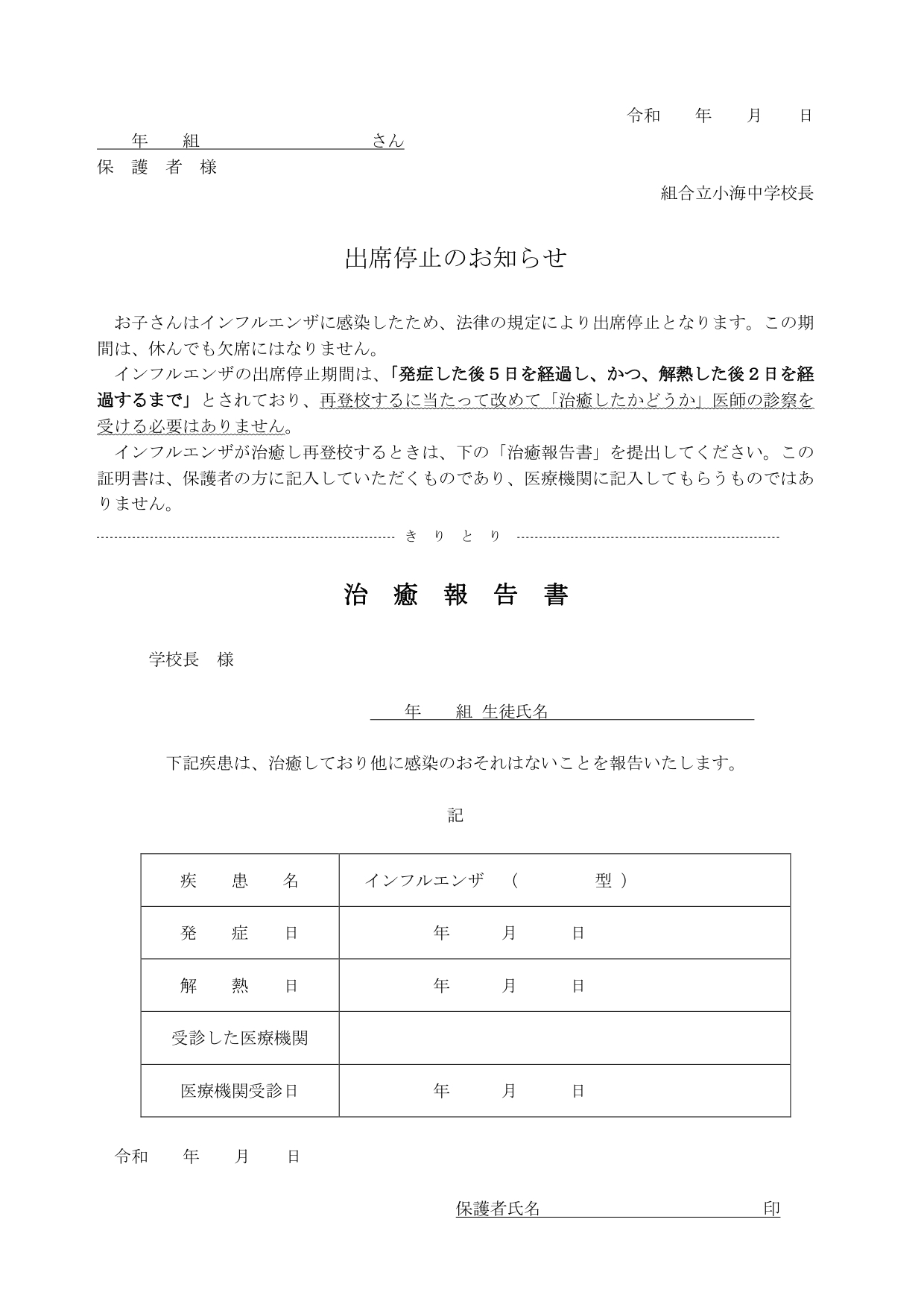 ダウンロード 「コロナ感染症」と「インフルエンザ」は治癒報告書が違いますのでご注意ください。 ≪コロナ感染症罹患による出席停止に係る治癒報告書≫ クリックで拡大表示 ≪インフルエンザ罹患による出席停止に係る治癒報告書≫ クリックで拡大表示